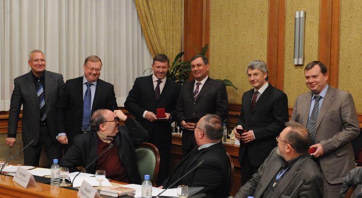Председатель ИППО С. В. Степашин вручает членские билеты участникам рабочей группы по спасению библейской смоковницы 17 декабря 2009 г.