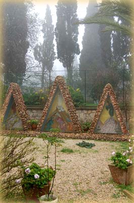 Несколько позднее, чем было осуществлено православное строительство на горе Фавор, католические монахи-францисканцы начали работы на другой стороне горы Фавор по восстановлению руин, оставшихся от крестоносцев и от еще более древних построек. В 1873 году ими была устроена небольшая часовня на месте монастыря, построенного еще Танкредом. Русские паломники, посещавшие Фавор, сообщали, что католическая обитель на Фаворе была в те годы очень скромной/52/. Об этом пишет, например, священник Александр Анисимов из Харьковской губернии, сподобившийся побывать на Фаворе в 1881 году. Когда он со своими спутниками подошел к католической обители, то вышедший им навстречу францисканский монах пригласил русских паломников осмотреть католическую капеллу. „Она небольшая и имеет вид часовни, — пишет О. Александр.— Особенно замечательного в ней мы ничего не заметили, исключая чудную икону Преображения Господня, составленную из подобранных по цвету красок иконы разноцветных камней“/53/.