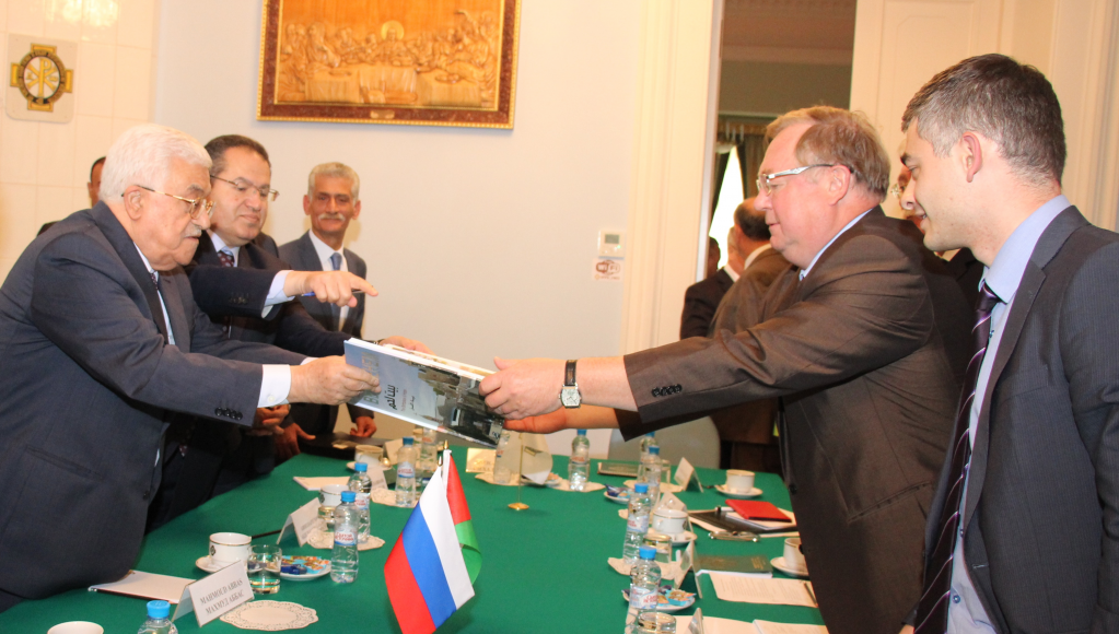 В завершении беседы Сергей Степашин подарил на память палестинскому лидеру большую тарелку из Гжели со знаком ИППО. В ответ Махмуд Аббас вручил Председателю ИППО подарочное издание – книгу «Вифлеем».