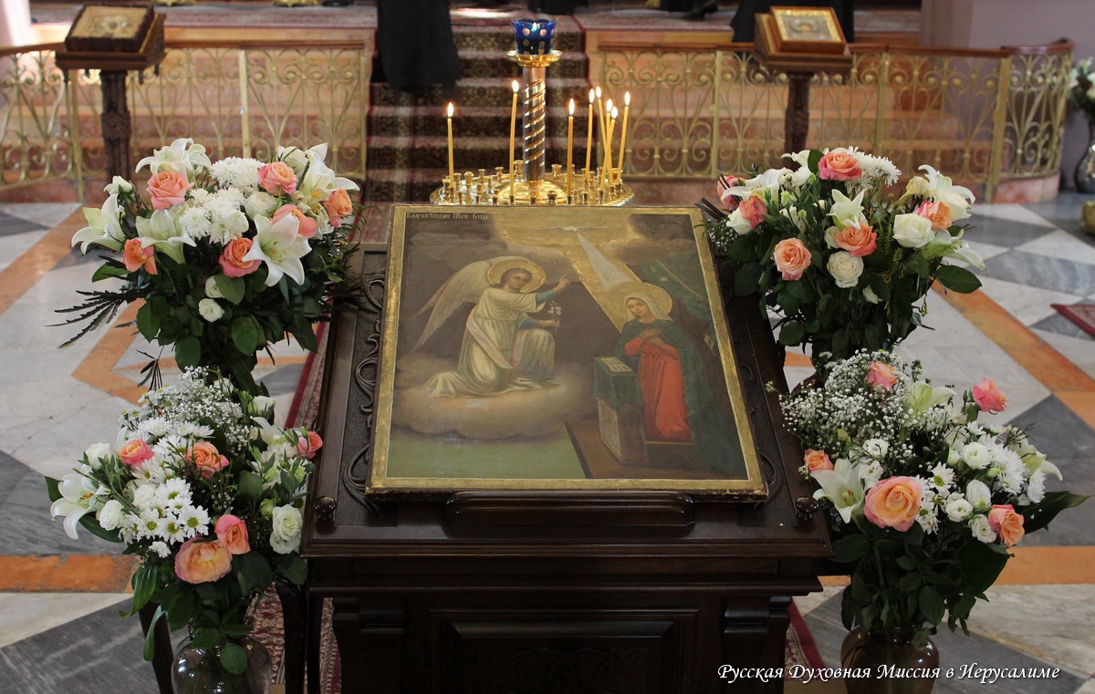 У источника Божией Матери в Эйн-Кареме, где по преданию и состоялась та историческая встреча, икону встречала игумения Георгия (Щукина) с сёстрами Горненского монастыря. Оттуда крестный ход, согласно специальному чину, берущему своё начало со времени архимандрита Антонина (Капустина), с пением тропаря праздника проследовал к Казанскому храму Горненской обители. Весь путь до монастыря был устлан зелёной травой, а дорожки вокруг храма насельницы с любовью украсили цветами. Икона, которую сёстры несли по очереди, была поставлена в храме на особое место. Не случайно рядом с иконой был установлен игуменский жезл – пока образ находится в монастыре, сама Пречистая является здесь Игуменией и все подходят к Ней под благословение. Икона Благовещения будет находиться в Горненской обители три месяца, до праздника Рождества св. Иоанна Предтечи, после чего чтимый образ аналогичным образом вернётся в Троицкий собор Русской Духовной Миссии.