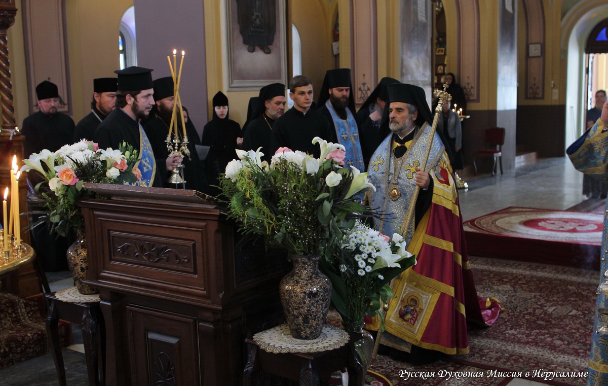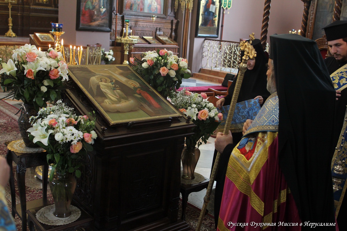 12 апреля по благословению Блаженнейшего Патриарха Иерусалимского Феофила в монастырь прибыл иерарх Иерусалимской Церкви митрополит Замбийский Иоаким. Вместе с Начальником Русской Духовной Миссии архимандритом Александром и другими клириками Миссии он совершил Божественную литургию в честь праздника Целования. Богослужение совершалось в соборе Всех Святых в земле Российской просиявших и завершилось крестным ходом вокруг храма с Благовещенской иконой, после чего все молившиеся за Литургией были приглашены на праздничную трапезу.