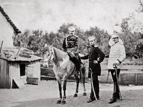 Великий князь Сергей Александрович (в центре), полковник Владимир Владимирович Скарятин и князь Александра фон Баттенберг (справа), Пордим, 1877