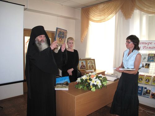 В дар библиотеке архимандрит Тихон передал новые книги – «Патриарх Гермоген. Стояние в вере» и «Царское Верхотурье».