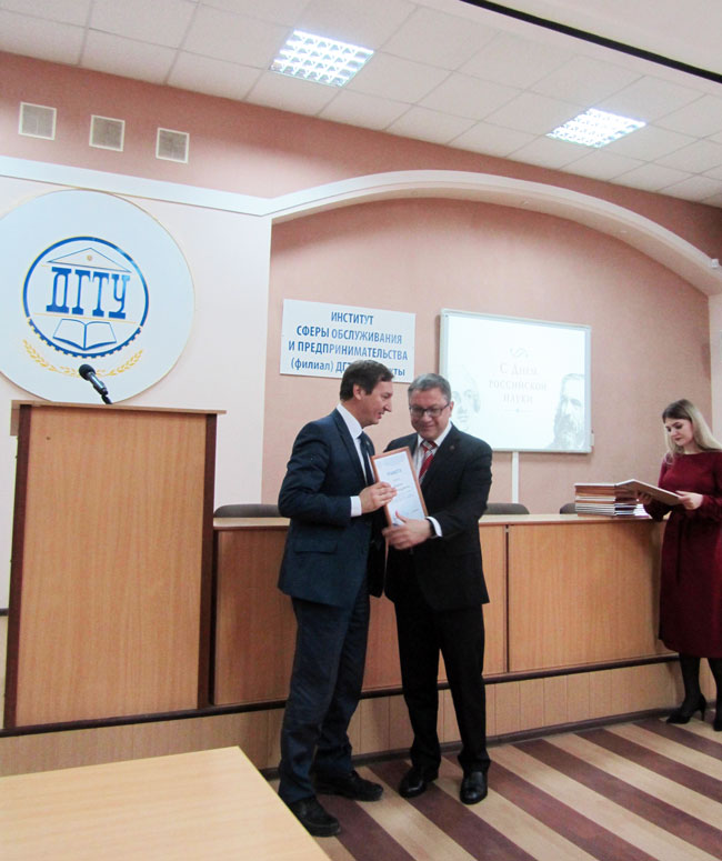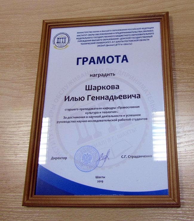 В торжественной обстановке директор института профессор Сергей Страданченко поздравил приглашённых коллег и вручил почётные грамоты сотрудникам, внёсшим значительный вклад в научную деятельность вуза в текущем учебном году. Среди награждённых – древлехранитель Шахтинской епархии, старший преподаватель кафедры православной культуры и теологии ИСОиП (филиала) ДГТУ, действительный член Императорского Православного Палестинского Общества Илья Шарков. Как отмечено в Почётной грамоте, руководитель кафедрального научного студенческого кружка «Православный Восток» награждён «за достижения в научной деятельности и успешное руководство научно-исследовательской работой студентов».