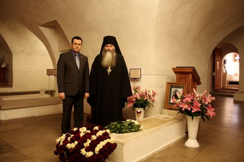 А. Н. Панин и архимандрит Тихон (Затекин) у могилы Великого Князя Сергея Александровича в Новоспасском монастыре, 27 февраля 2013 г.
