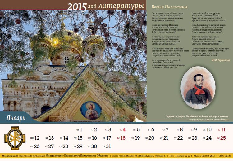 Императорское Православное Палестинское Общество издало календарь на 2015 год со стихами русских поэтов о Святой Земле. Концепцию календаря определил указ Президента России Владимира Путина о проведении в России в 2015 году Года литературы.