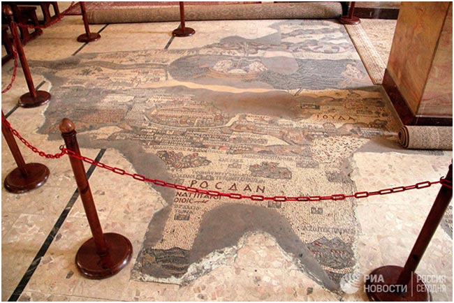 В иорданском городе Мадаба в православной церкви святого Георгия хранится настоящая «шпаргалка» по святым местам – как для верующих, так и для учёных. В 1894 году строители Георгиевского храма нашли фрагмент огромной мозаики VI века. На ней изображены многочисленные города и храмы на территории современных Израиля, Египта, Сирии, Иордании и Ливана. Это карта Святой Земли. Благодаря ей, в частности, и установили место крещения Христа.