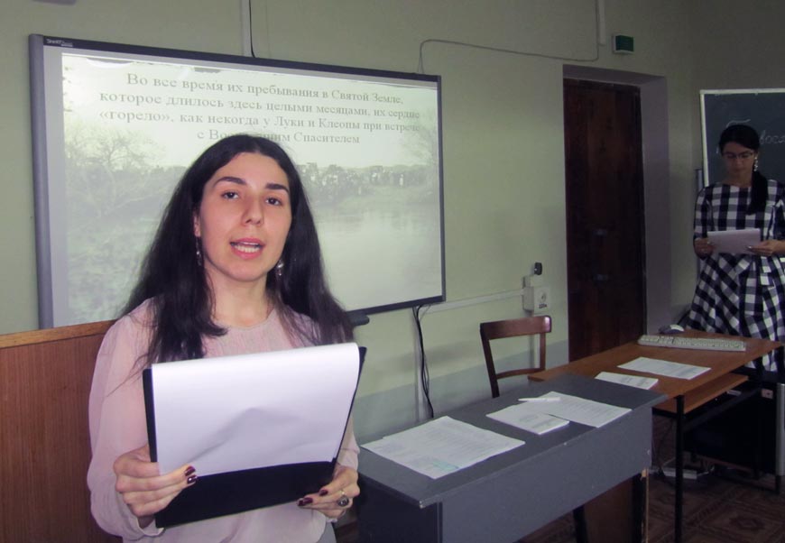 Первое место присуждено студенткам Л.Г. Симонян (научный руководитель – старший преподаватель И.Г. Шарков), А.А. Скрипке (научный руководитель – доцент Ю.А. Бирюкова), второе место заняли студентки Д.П. Слатвицкая (научный руководитель – старший преподаватель И.Г. Шарков) и Т.В. Степанова (научный руководитель – доцент Ю.А. Бирюкова), третье призовое место разделили студентки Н.А. Матюшенко (доклад был посвящён значению трудов архимандрита Антонина (Капустина) в деле созидания Русской Палестины) и А.Р. Илларионова (научный руководитель – старший преподаватель И.Г. Шарков).
