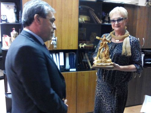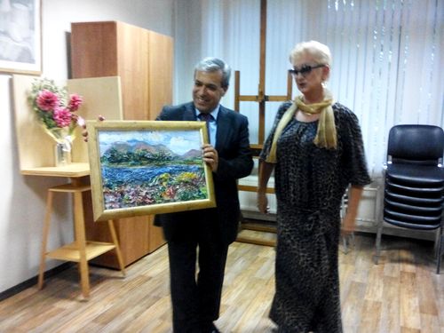 На память о встрече господину послу преподнесли в дар картину педагога Ольги Рассказовой, выполненную в авторской технике клеевой пластики.