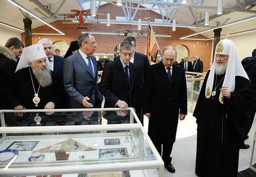 Глава государства и Предстоятель Русской Православной Церкви в сопровождении министра иностранных дел России С.В. Лаврова, губернатора Санкт-Петербурга Г.С. Полтавченко, управляющего делами Московской Патриархии митрополита Санкт-Петербургского и Ладожского Варсонофия и настоятеля храма протоиерея Геннадия Зверева осмотрели экспозицию церковного музея.