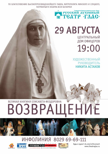 29 августа в Минске на одной из лучших сценических площадок города – в Доме офицеров – будет продемонстрирован репертуарный «самоцвет» русского духовного театра «Глас» – спектакль «Великая Княгиня Елизавета Федоровна Романова. Возвращение», - сообщает сайт театра. Спектакль удостоен многих российских и международных наград. В постановке занята практически вся труппа. В главной роли Великой Княгини Елизаветы Федоровны – лауреат международных фестивалей, заслуженная артистка России Татьяна Белевич.