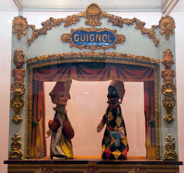 Театр включает ширму и семь персонажей французского кукольного театра «Гиньоль» («Guignol»): Арлекина, Капрала, Невесту, Полишинеля, Мадлон, Офицера и Служанку, выполненных с большим мастерством. На передней панели ширмы помещена товарная этикетка парижского магазина игрушек «AU PARADIS DES ENFANTS» («Детский Рай»), располагавшегося в центре Парижа на пересечении улиц Риволи и де Лувр. На боковой створке ширмы наклеена этикетка с надписью чернилами «Александровский дворец пол. Насл-ка Игральная № 333» – музейная маркировка, которая свидетельствует: театр находился в Александровском дворце Царского Села, в Игральной комнате цесаревича на Детской половине дворца. Изображение театра можно увидеть и на акварели 1931 г., находящейся в коллекции ГМЗ «Царское Село».