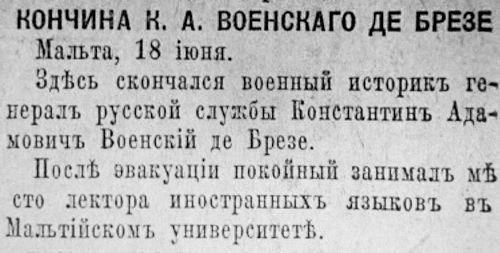 В 1919 году К.А. Военский эмигрировал на Мальту. Преподавал в местном университете. Скончался 18 июня 1928 года.