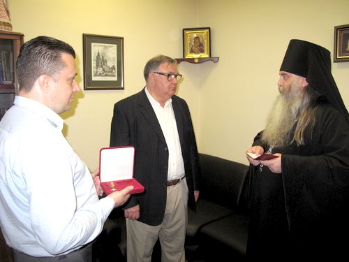 Обсуждение рабочих вопросов предварило вручение Сергею Владимировичу Мироненко медали святого благоверного князя Георгия Всеволодовича III степени, которой он был удостоен за заслуги перед Нижегородской епархией. По благословению митрополита Нижегородского и Арзамасского Высокопреосвященного Георгия епархиальный знак отличия со словами благодарности вручил профессору Мироненко архимандрит Тихон.