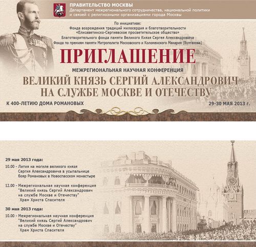 29–30 мая 2013 года в храме Христа Спасителя состоится межрегиональная научная конференция «Великий князь Сергий Александрович на службе Москве и Отечеству». Конференция пройдет в рамках программы «На службе Москве и Отечеству. Великий князь Сергий Александрович и великая княгиня Елизавета Федоровна», разработанной по инициативе Фонда содействия возрождению традиций милосердия и благотворительности «Елисаветинско-Сергиевское просветительское общество» в содружестве с другими научными, церковными и общественными организациями, в том числе Императорским Православным Палестинским Обществом и мэрией г. Москвы на 2013–2014 гг.