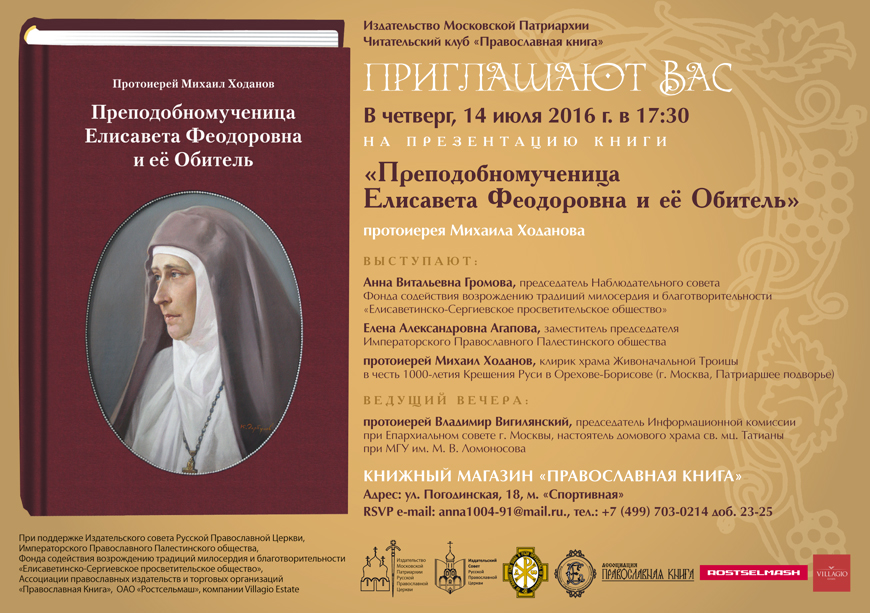 Издательство Московской Патриархии Русской Православной Церкви, Читательский клуб «Православная книга» на Погодинской улице приглашают на презентацию книги протоиерея Михаила Ходанова«Преподобномученица Елисавета Феодоровна и ее Обитель».