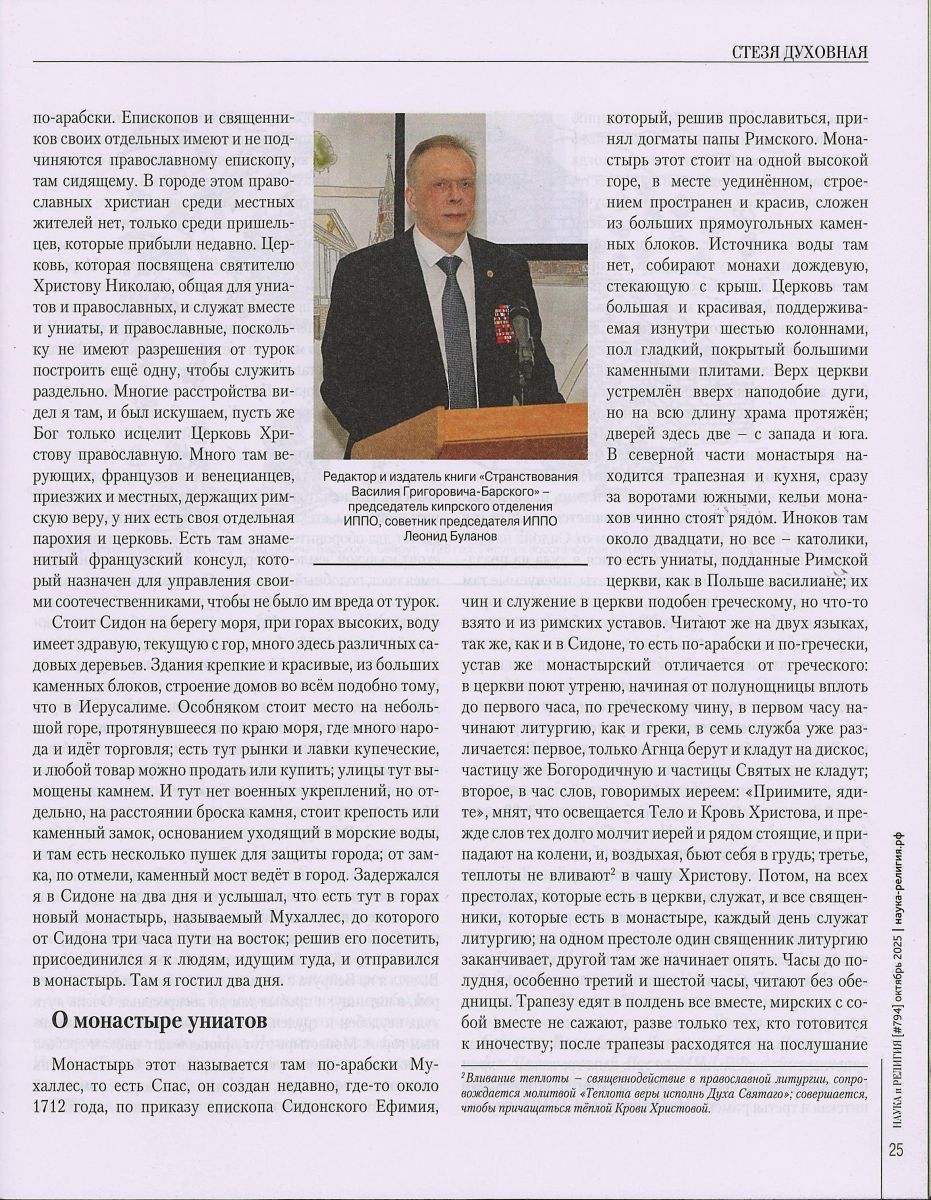Представляем вашему вниманию фрагмент из книги «Странствования Василия Григоровича-Барского по святым местам с 1723 по 1747 год» 2 том (редактор, издатель, переводчик со старославянского и старорусского языка – руководитель Кипрского отделения ИППО, советник Председателя ИППО Леонид Буланов). Книга издана под редакцией Председателя ИППО Сергея Степашина, под эгидой Императорского Православного Палестинского Общества.