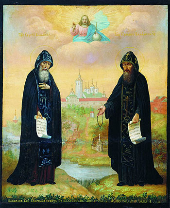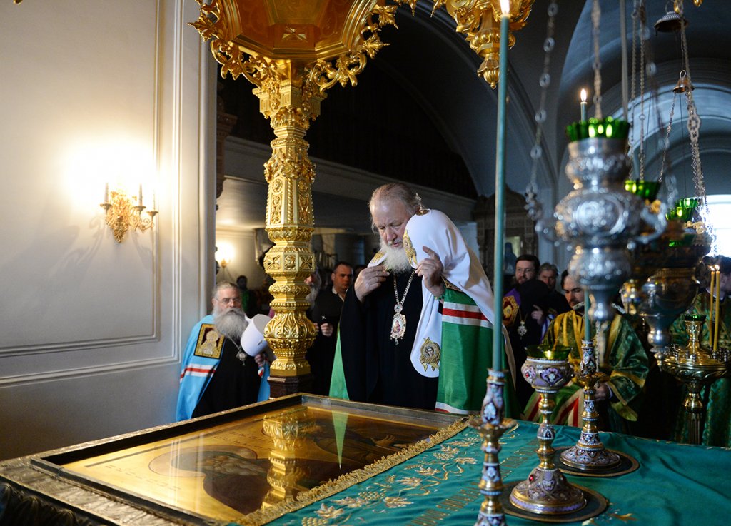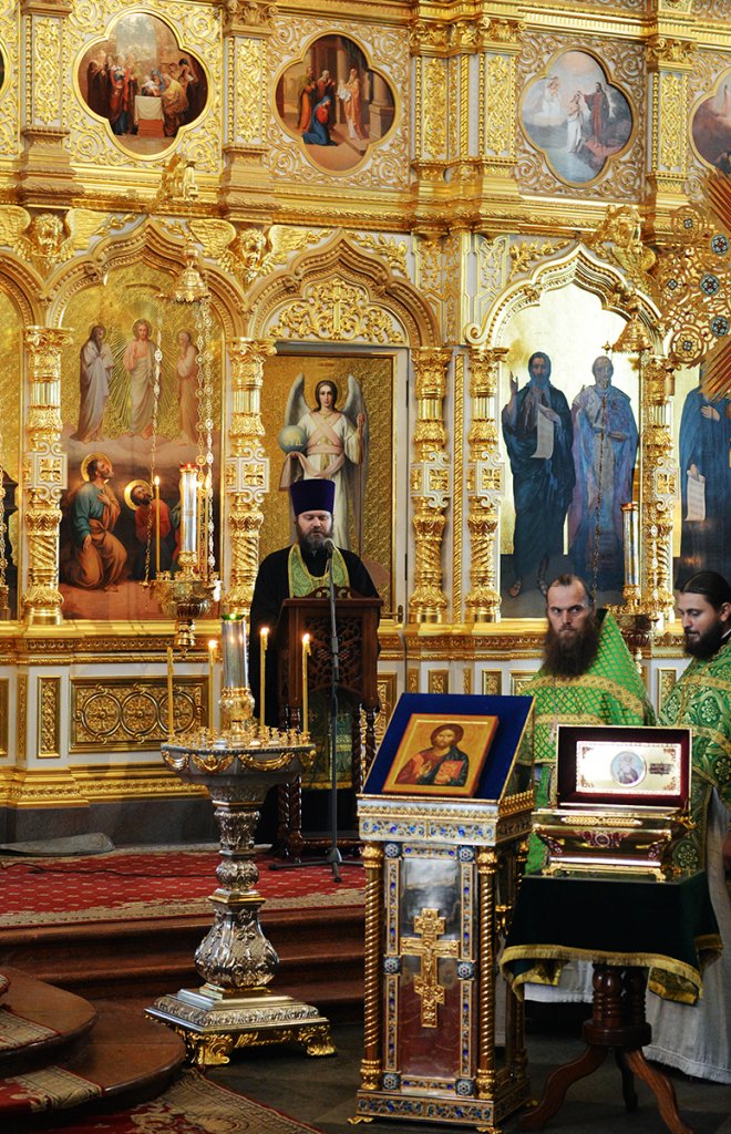 Затем Патриарх Кирил совершил славление у честных мощей преп. Сергия И Германа в нижнем храме Спасо-Преображенского собора.