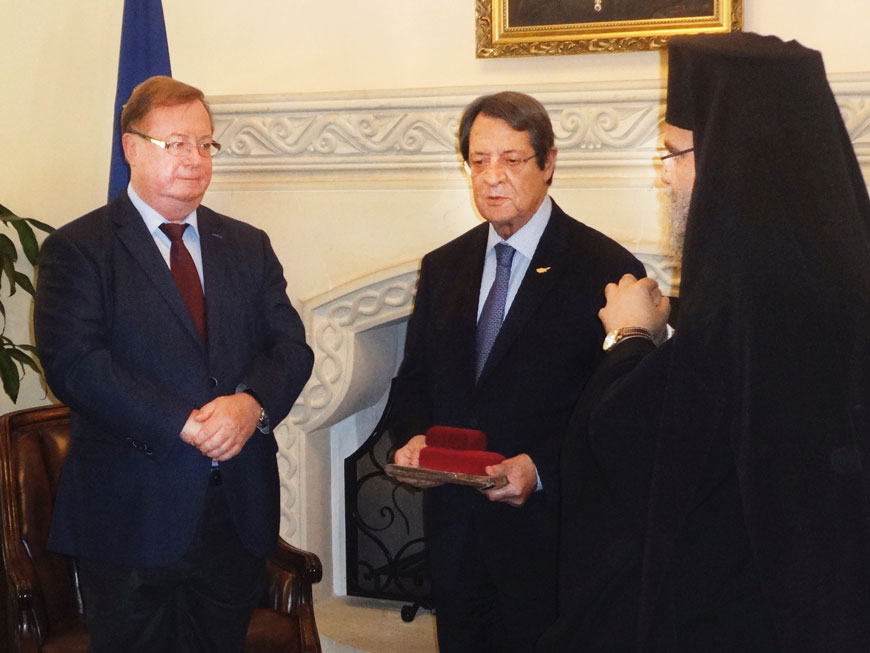 Председатель Императорского Православного Палестинского Общества Сергей Степашин, Президент Республики Кипр Никос Анастасиадидис, митрополит Тамасосский и Оринийский Исаия, руководитель Кипрского отделения ИППО Леонид Буланов