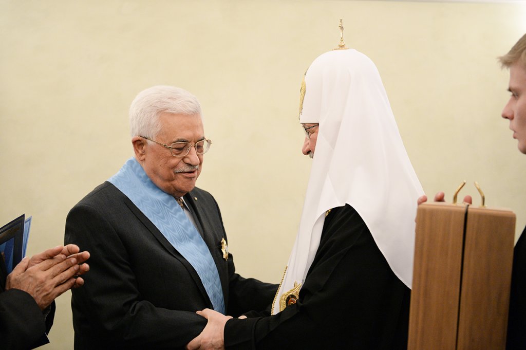 Святейший Патриарх Кирилл, Почетный член ИППО, вручил Президенту Государства Палестина Махмуду Аббасу Орден Чести и Славы I степени