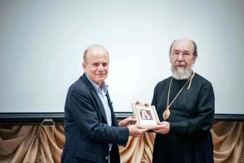 Зарубежный гость поблагодарил собравшихся за теплый прием и интересное общение, и преподнес митрополиту Анастасию печатные и электронные экземпляры своих работ.