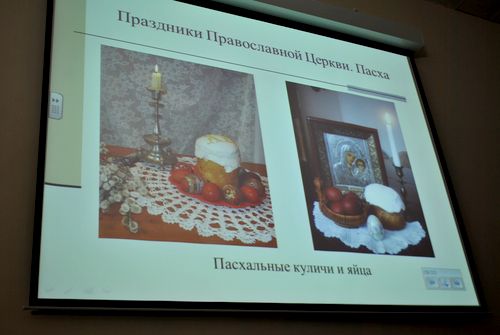 На слайдах фотопрезентации были представлены иконы Воскресения и пасхальные сувениры: ювелирные, расписные деревянные яйца, «писанки», «крапанки», «драпанки» и культовые блюда праздничного стола: крашеные яйца, куличи и пасхи.