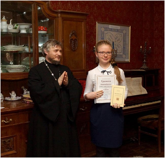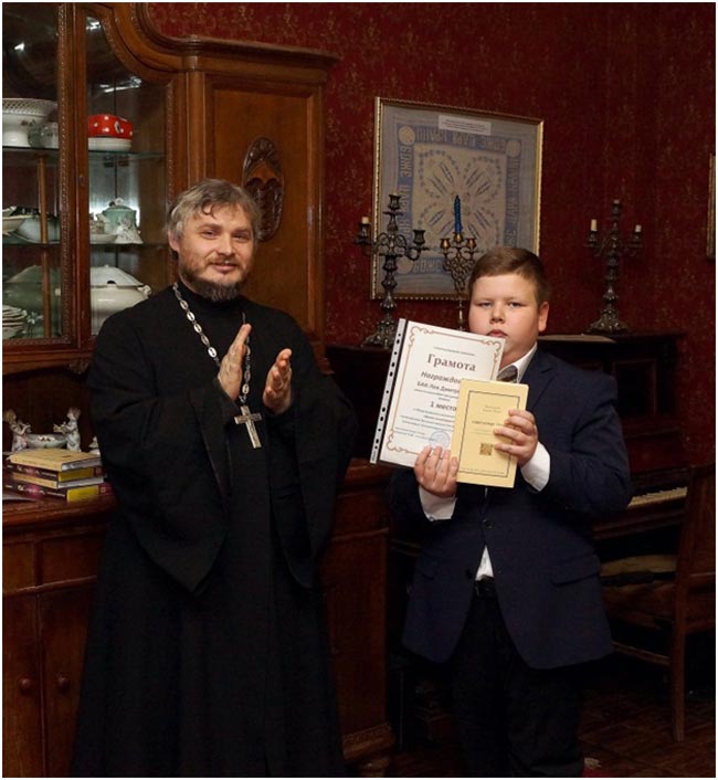 От Тульской духовной семинарии, в стенах которой проходила церемония награждения, школьников поздравил священник Константин Ситников. Он подарил детям и их педагогам книгу протоиерея Георгия Панова «История благотворительности и призрения в Тульском крае».